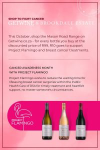 Brookdale and Getwine have launched a fundraising initiative in aid of Project Flamingo, which will run throughout Breast Cancer Awareness Month. During October 2022, Brookdale Estate and Getwine will pledge a R10 donation to Project Flamingo for every bottle of Brookdale Mason Road wines sold to the public via the Getwine online platform.